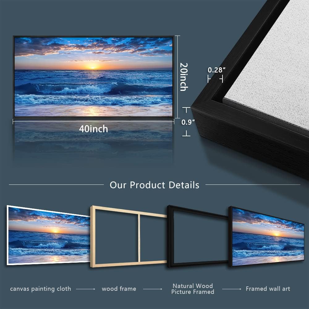 Sea Beach Framed Canvas Wall Art For Living Room Wall Decor For Bedroom Home Decor Blue Ocean Canvas Pictures Artwork Sunny Sea View Wave Painting Office Wall Decorations Black Framed 20" X 40"