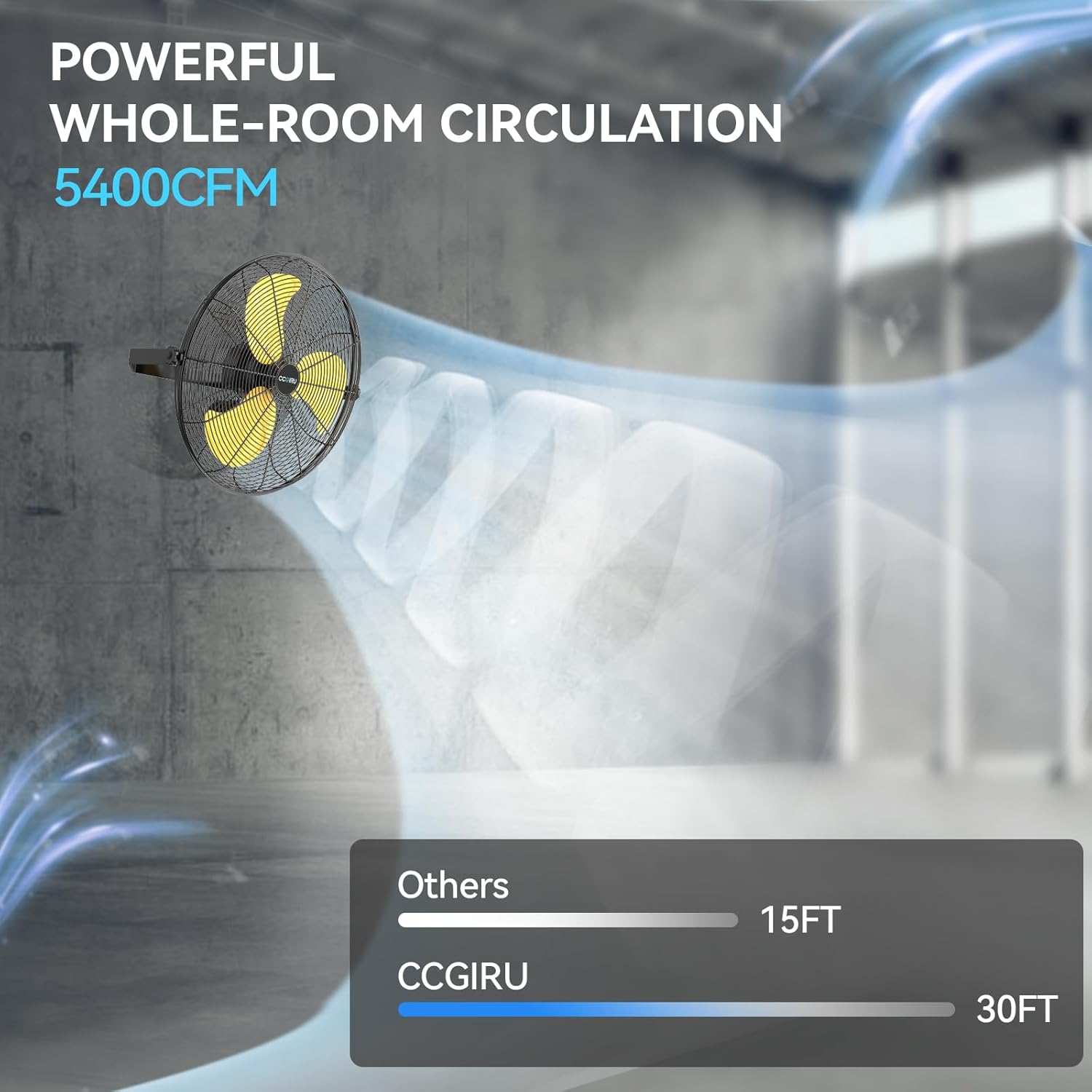 - 3 Speeds Dynamic Airflow: Upgraded the motor on the original basis, making the 20-inch outdoor industrial wall mount fan more powerful than before. In high speed, the blowing distance can reach to 30 ft. High velocity fan runs at 5400 CFM with pull chain in high speed, medium 4300 CFM, low 3900 CFM