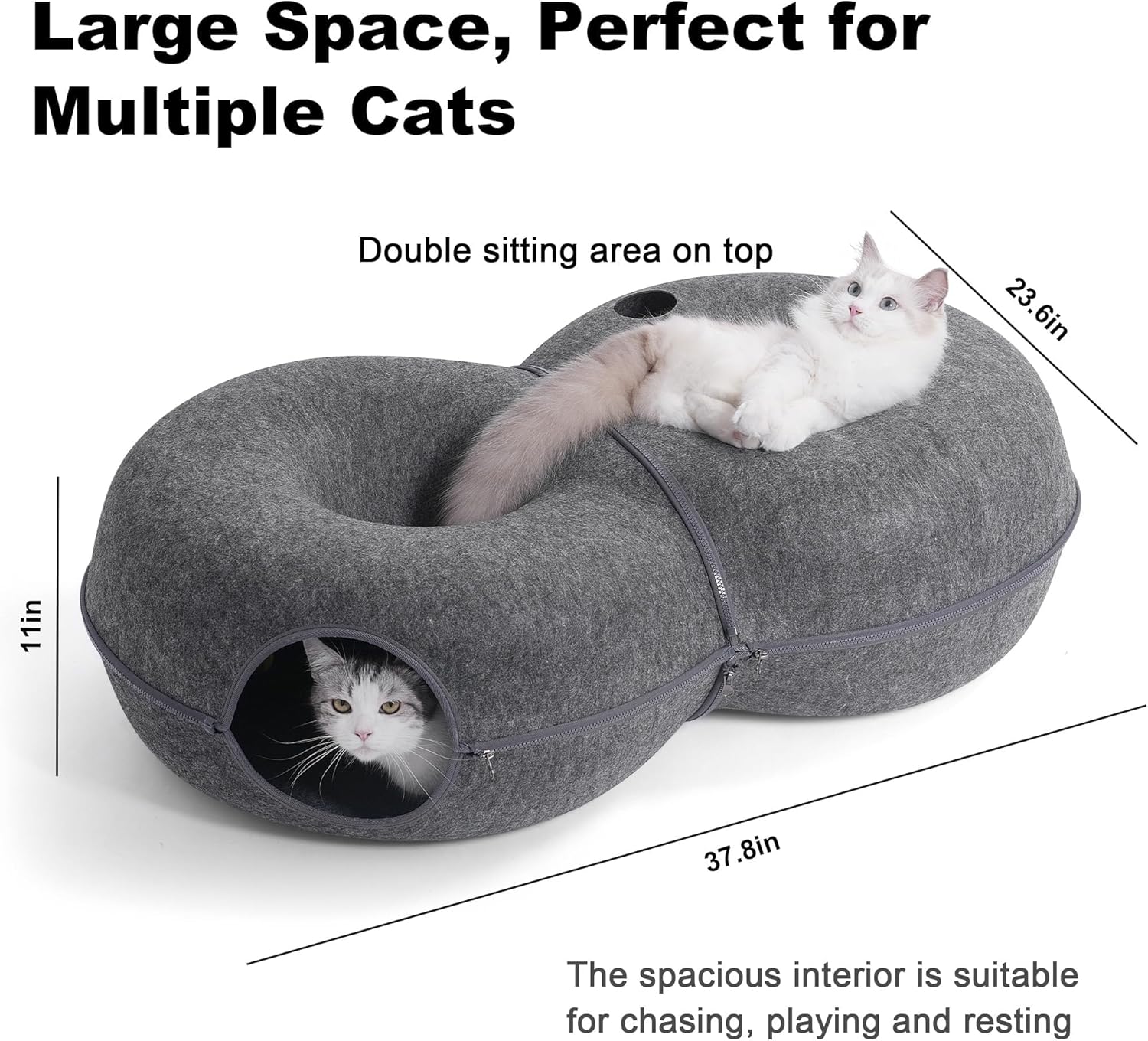 - Larger Space: 38 in L x 24 in W x 11 in H, has 2 rest areas on the top, which is more suitable for multiple cats to rest. The double-column design inside the cat cave, makes it more secretive, giving cats enough space to hide and rest. A perfect spot for multiple cats to play