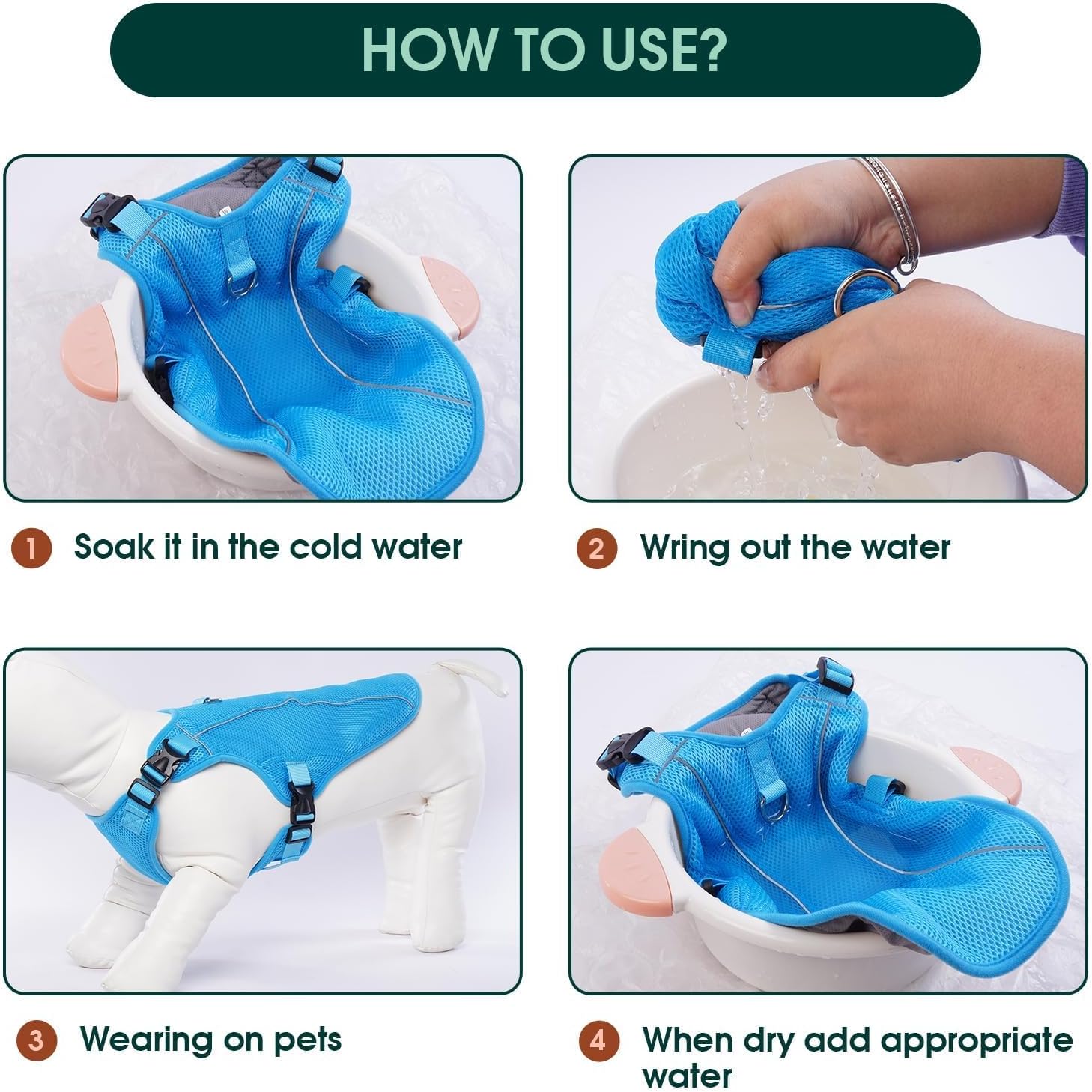 - HOW TO USE: Simply soak the cooling undershirt in cold water, wring it out and put it on your dog. As the vest gradually evaporates, it lowers your dog's body temperature and provides a soothing cooling effect. By using this cooling vest, you can greatly reduce your dog's risk of elevated temperatures and heat-related problems