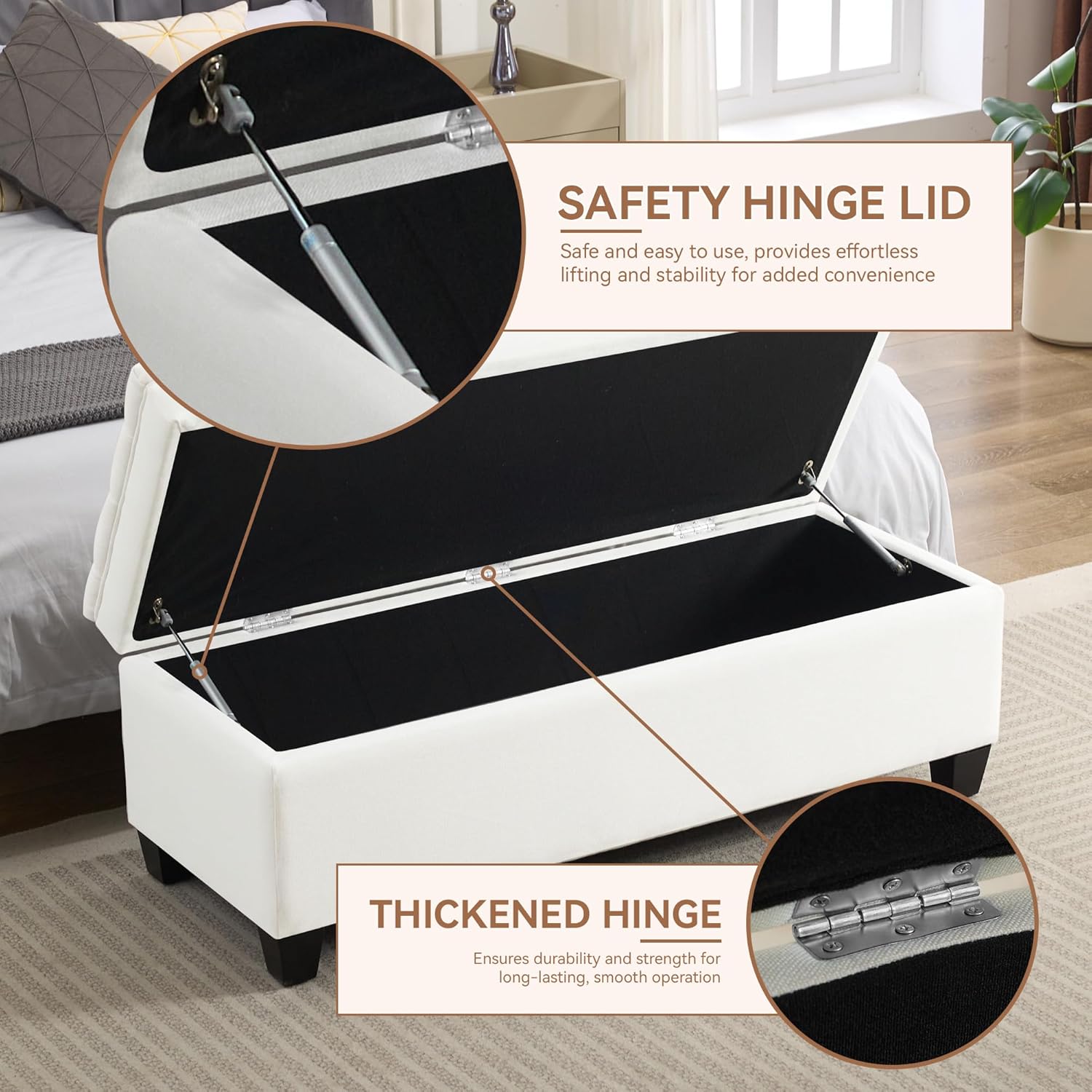 - Enhanced Safety: The use of thickened and upgraded gas lift device makes it easier to open and close the bedroom storage bench with less effort, while avoiding the risk of pinching the hand, providing you with a safe and convenient use experience. Besides, all edges of the ottoman with storage are carefully treated, no sharp corners, to protect the safety of your family
