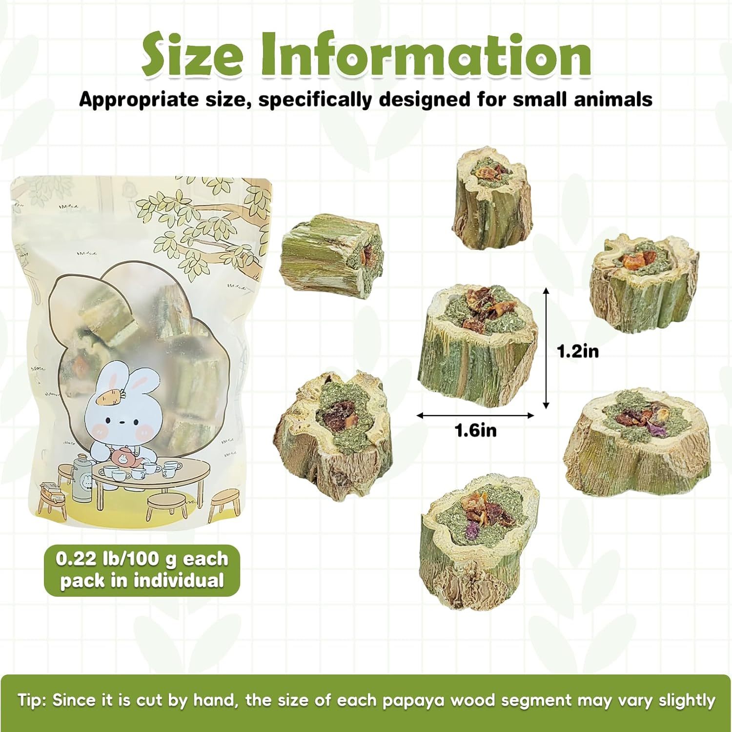 - Help with Teething: Rabbits' teeth grow continuously, and if they are not properly worn down, they may become too long, affecting their ability to eat and their health. Papaya wood rabbit chews are moderately hard, suitable for rabbits to grind their teeth and maintain dental health